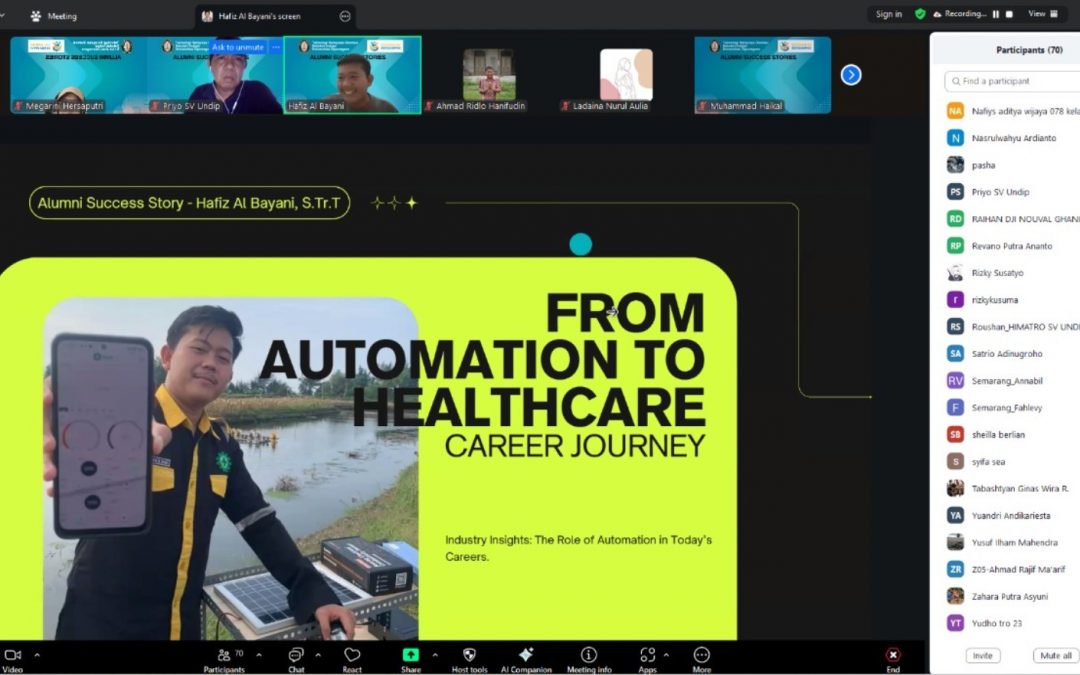 Semarang (3/11/2025) – Program Studi Teknologi Rekayasa Otomasi (TRO) Sekolah Vokasi Universitas Diponegoro kembali menyelenggarakan kegiatan “Alumni Success Stories” secara daring melalui Zoom Meeting pada Senin, 3 November 2025, pukul 10.00 – 12.00 WIB.